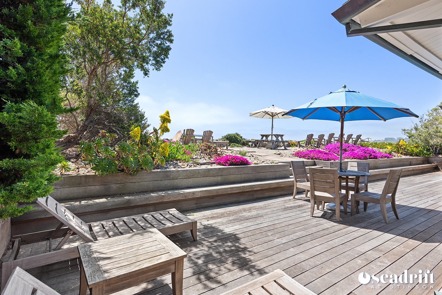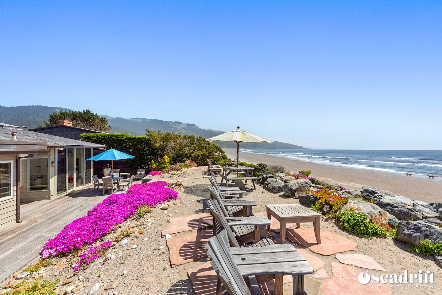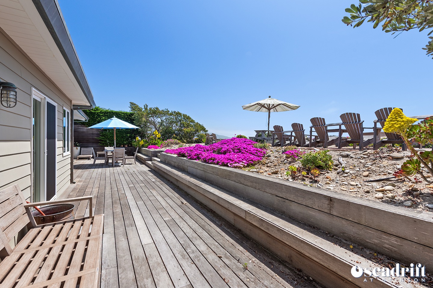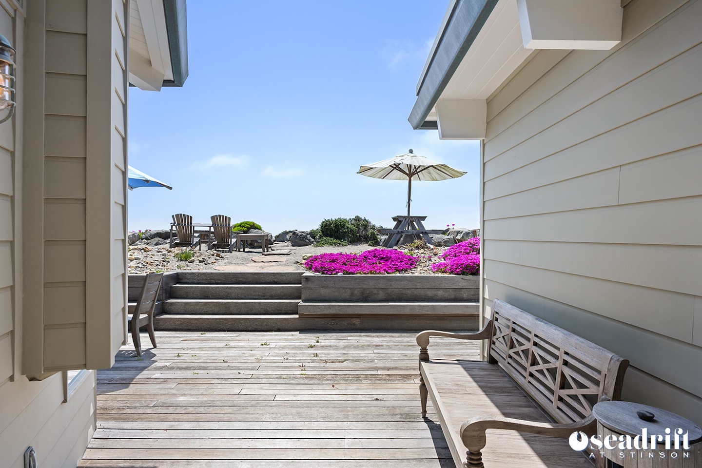 Oceanside is a dual leveled deck area and yet another delightful place to engage with family and friends. A couple chaises for a bit of private sunbathing, sofas and a table and chairs on the lower level. Just a few steps up are a couple seating areas and a picnic table overlooking the dreamy waves of Stinson Beach with stairs gliding easily to the golden sand.
