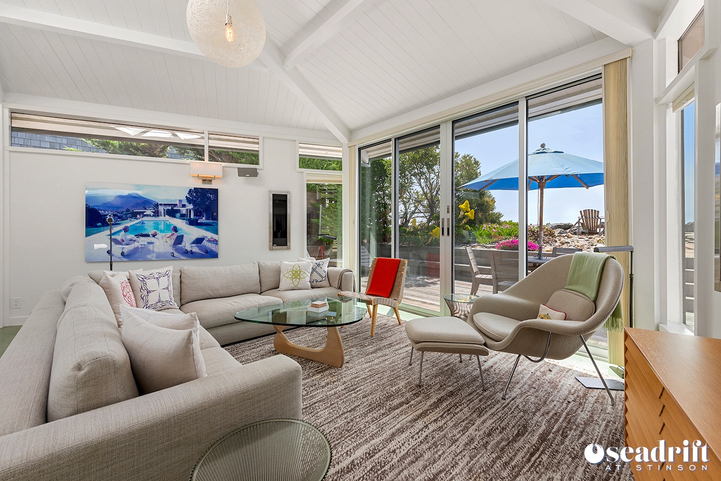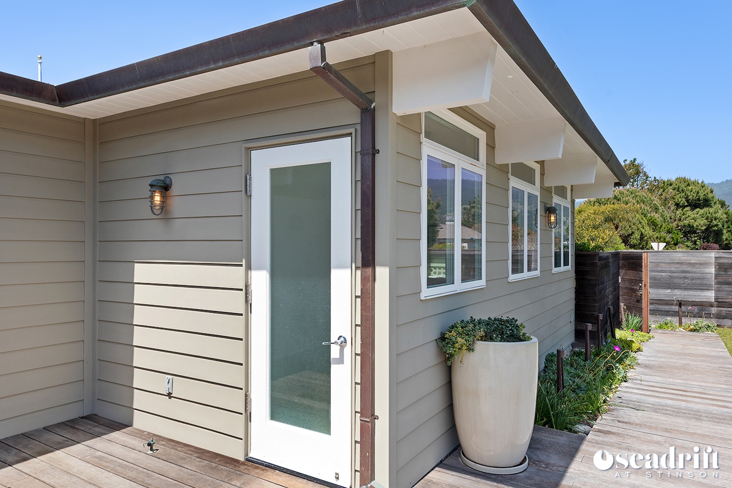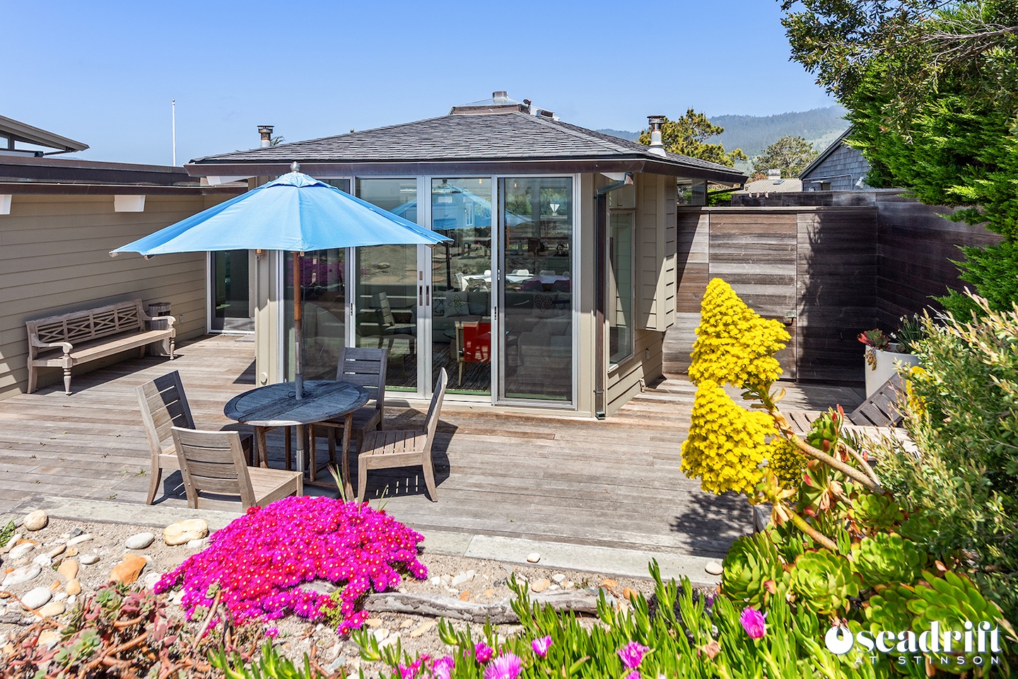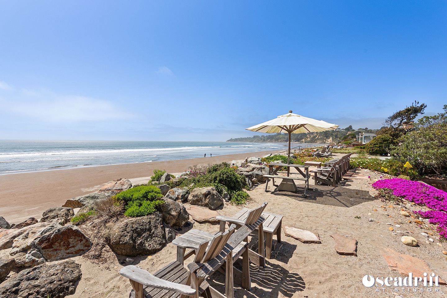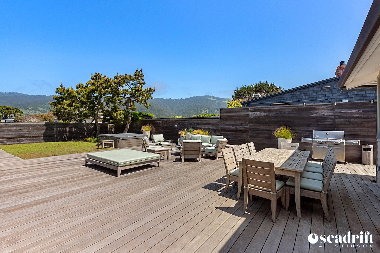 Oceanside is a dual leveled deck area and yet another delightful place to engage with family and friends. A couple chaises for a bit of private sunbathing, sofas and a table and chairs on the lower level. Just a few steps up are a couple seating areas and a picnic table overlooking the dreamy waves of Stinson Beach with stairs gliding easily to the golden sand.