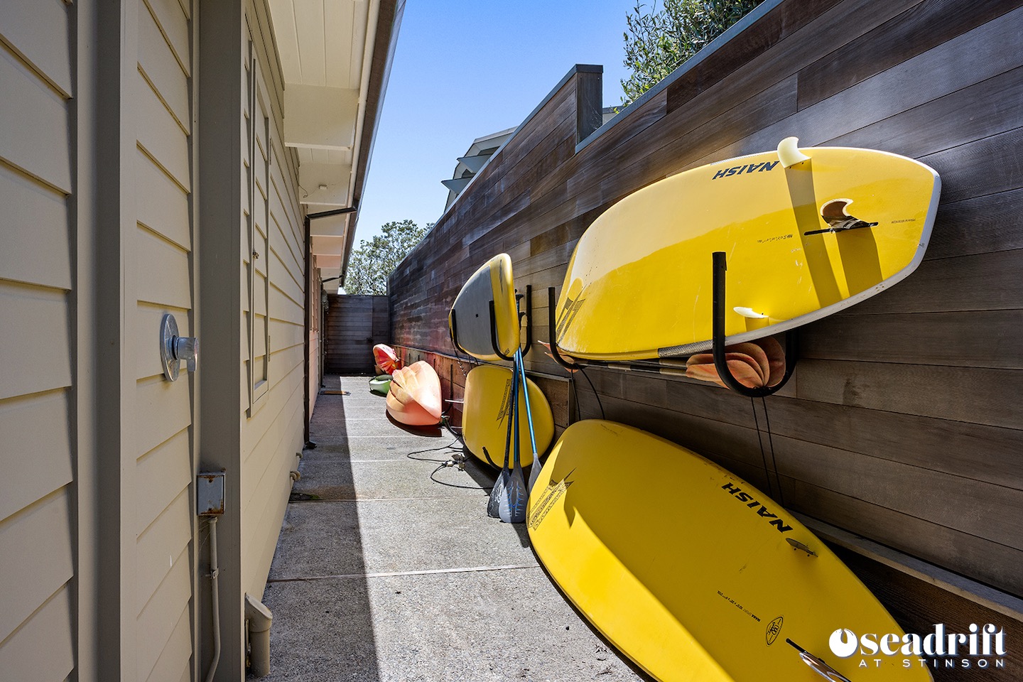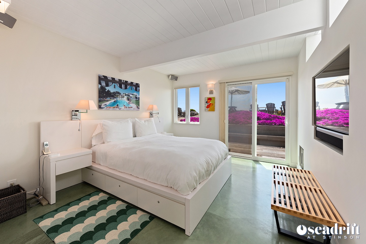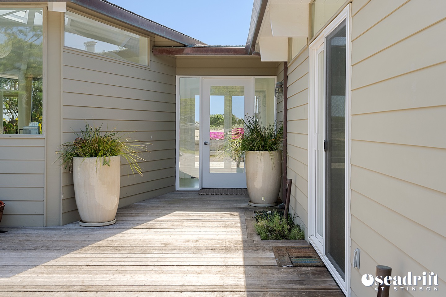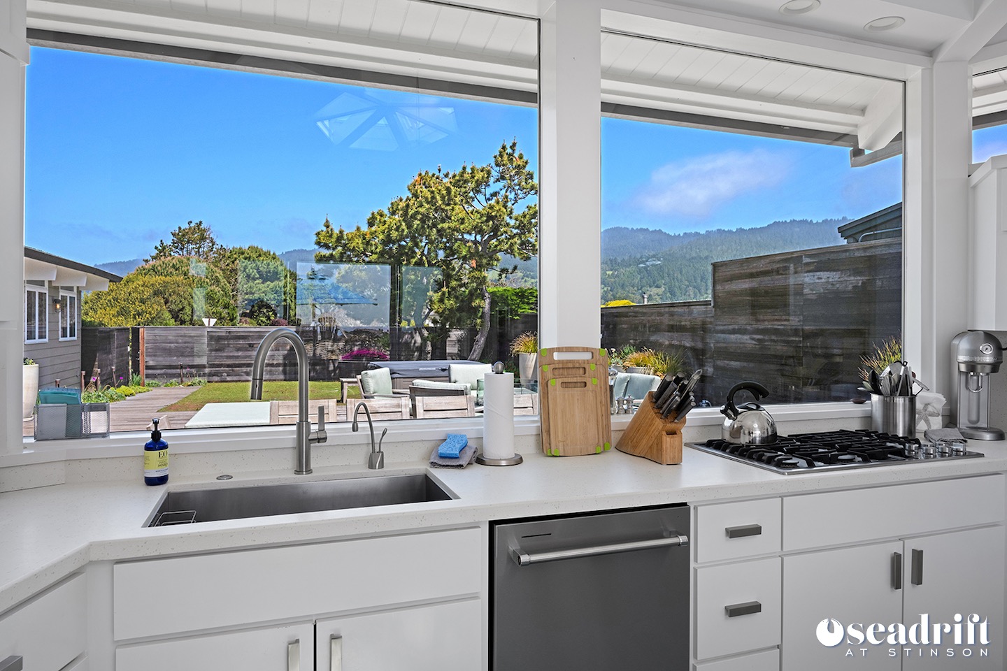 Oceanside is a dual leveled deck area and yet another delightful place to engage with family and friends. A couple chaises for a bit of private sunbathing, sofas and a table and chairs on the lower level. Just a few steps up are a couple seating areas and a picnic table overlooking the dreamy waves of Stinson Beach with stairs gliding easily to the golden sand.