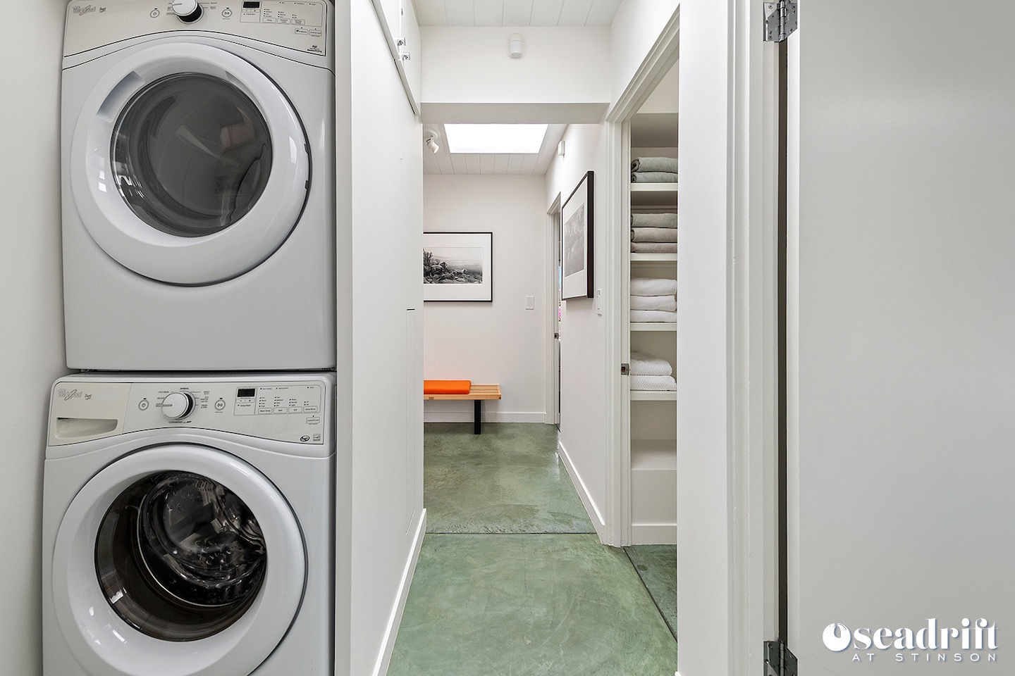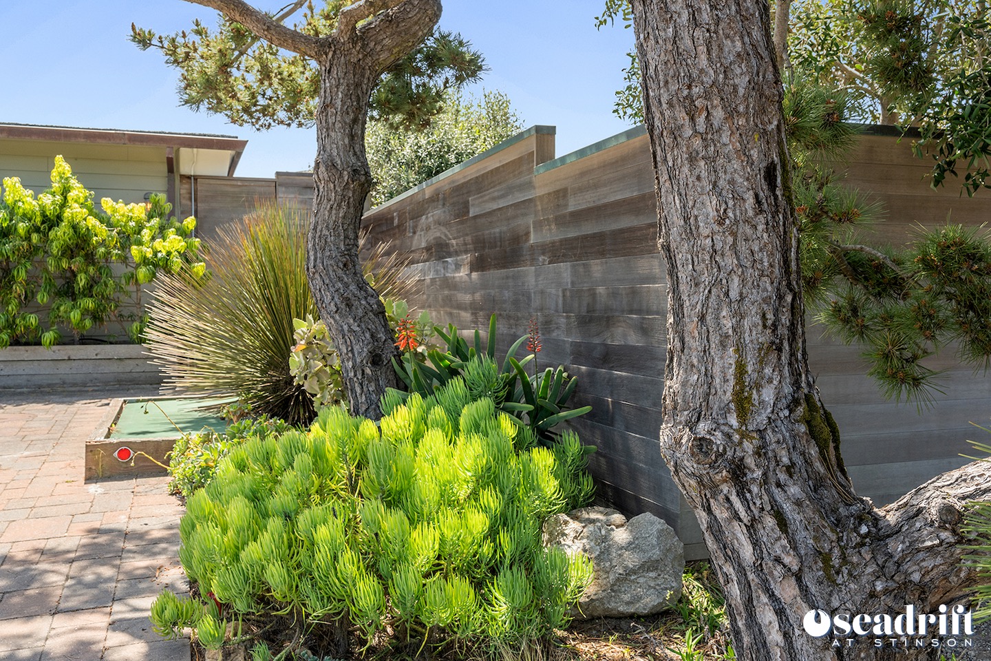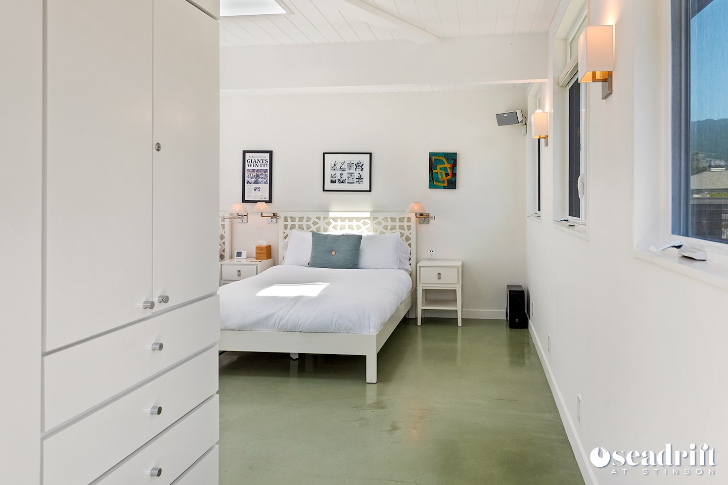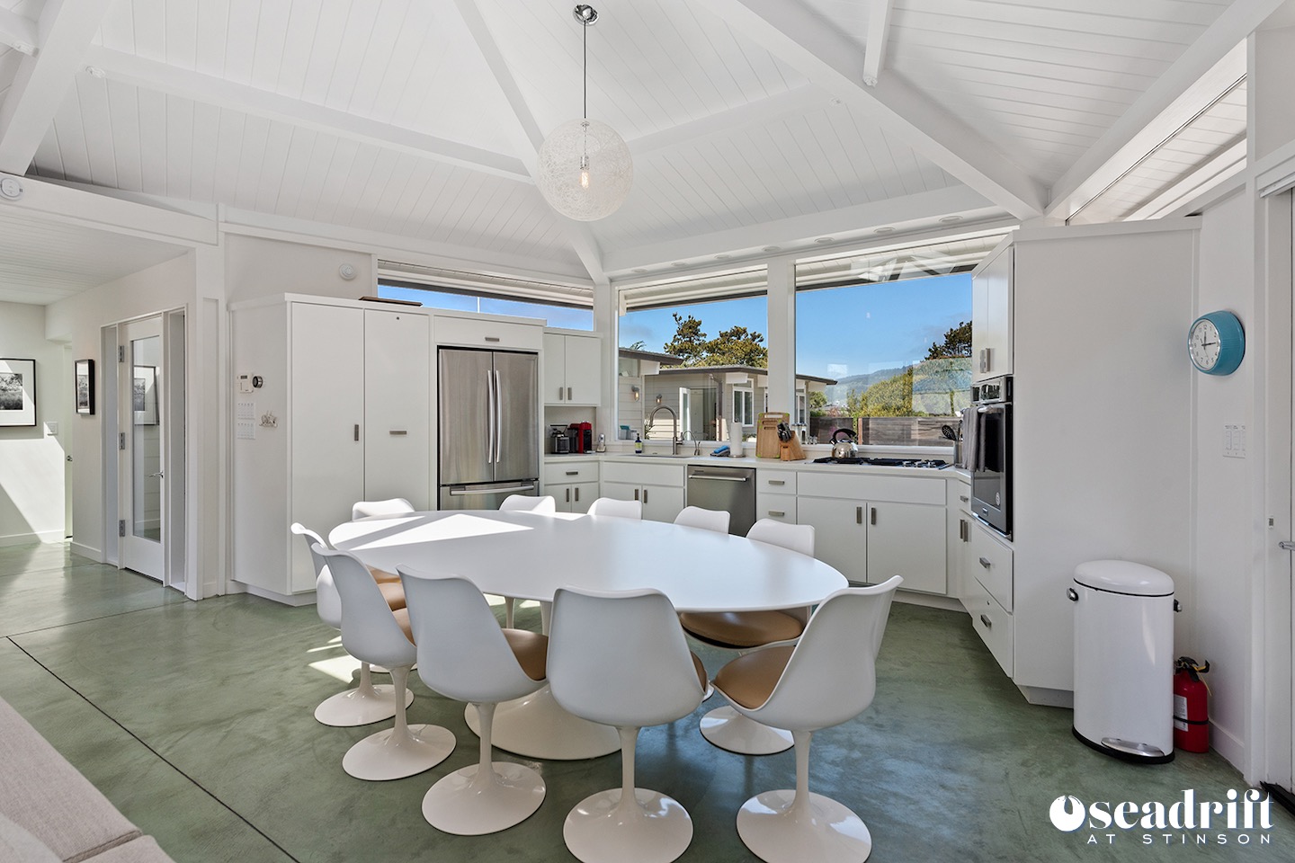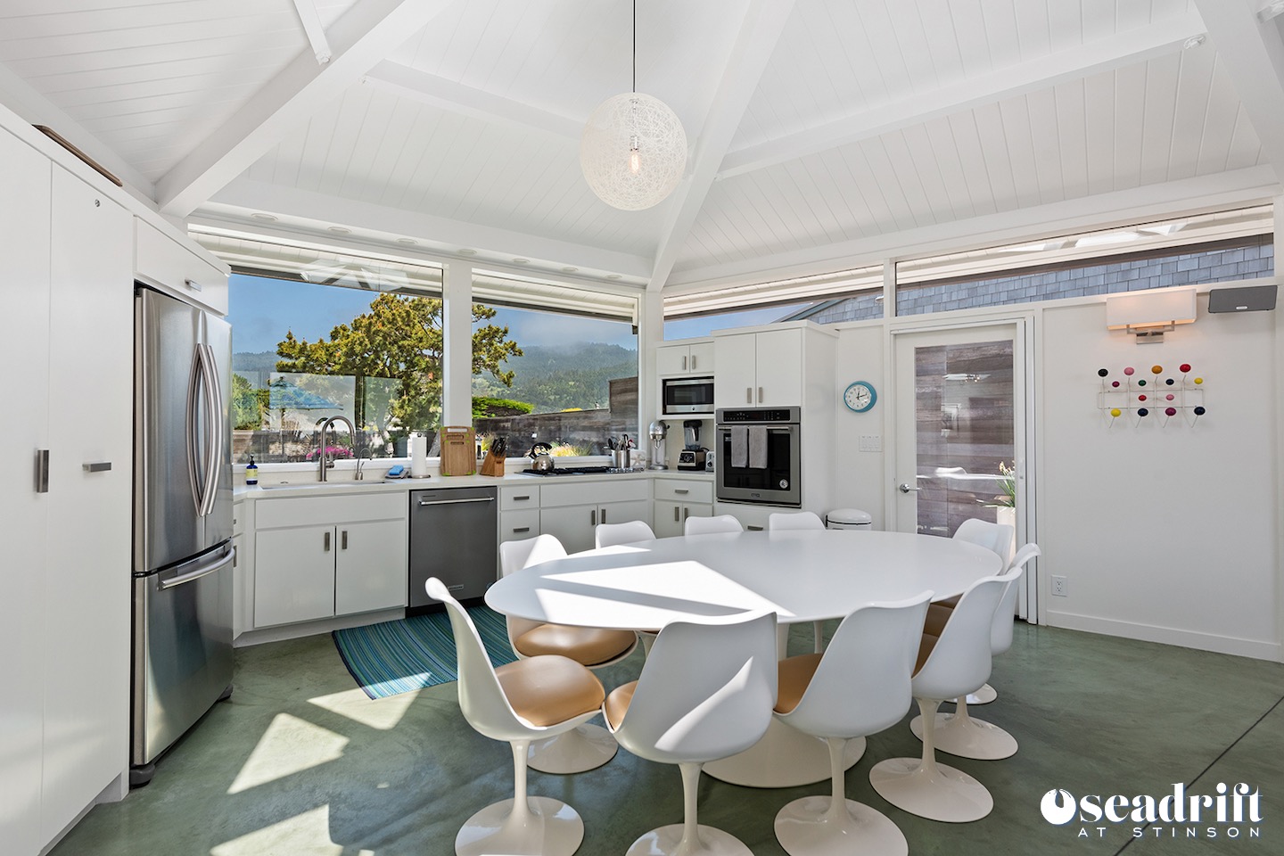Oceanside is a dual leveled deck area and yet another delightful place to engage with family and friends. A couple chaises for a bit of private sunbathing, sofas and a table and chairs on the lower level. Just a few steps up are a couple seating areas and a picnic table overlooking the dreamy waves of Stinson Beach with stairs gliding easily to the golden sand.