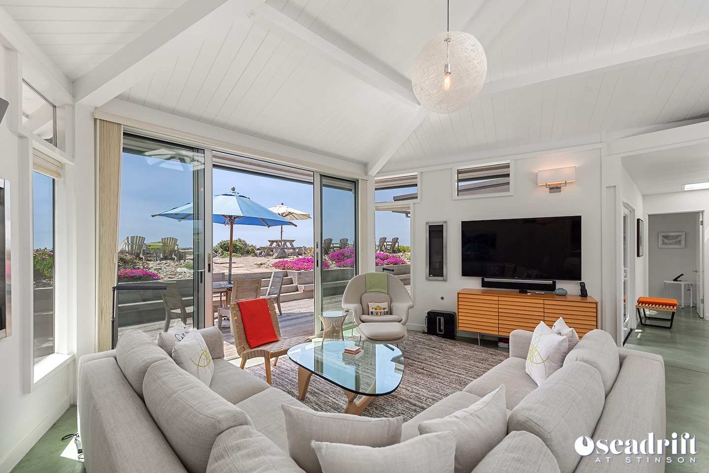 Light filled living, dining and kitchen under a domed shaped roof with skylights in the middle. Comfortable living room with floor to ceiling slider to the oceanside deck. Hidden LED light strips in the living room skylights make for ambient light you’ve never before experienced.