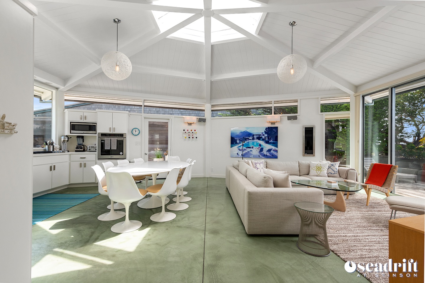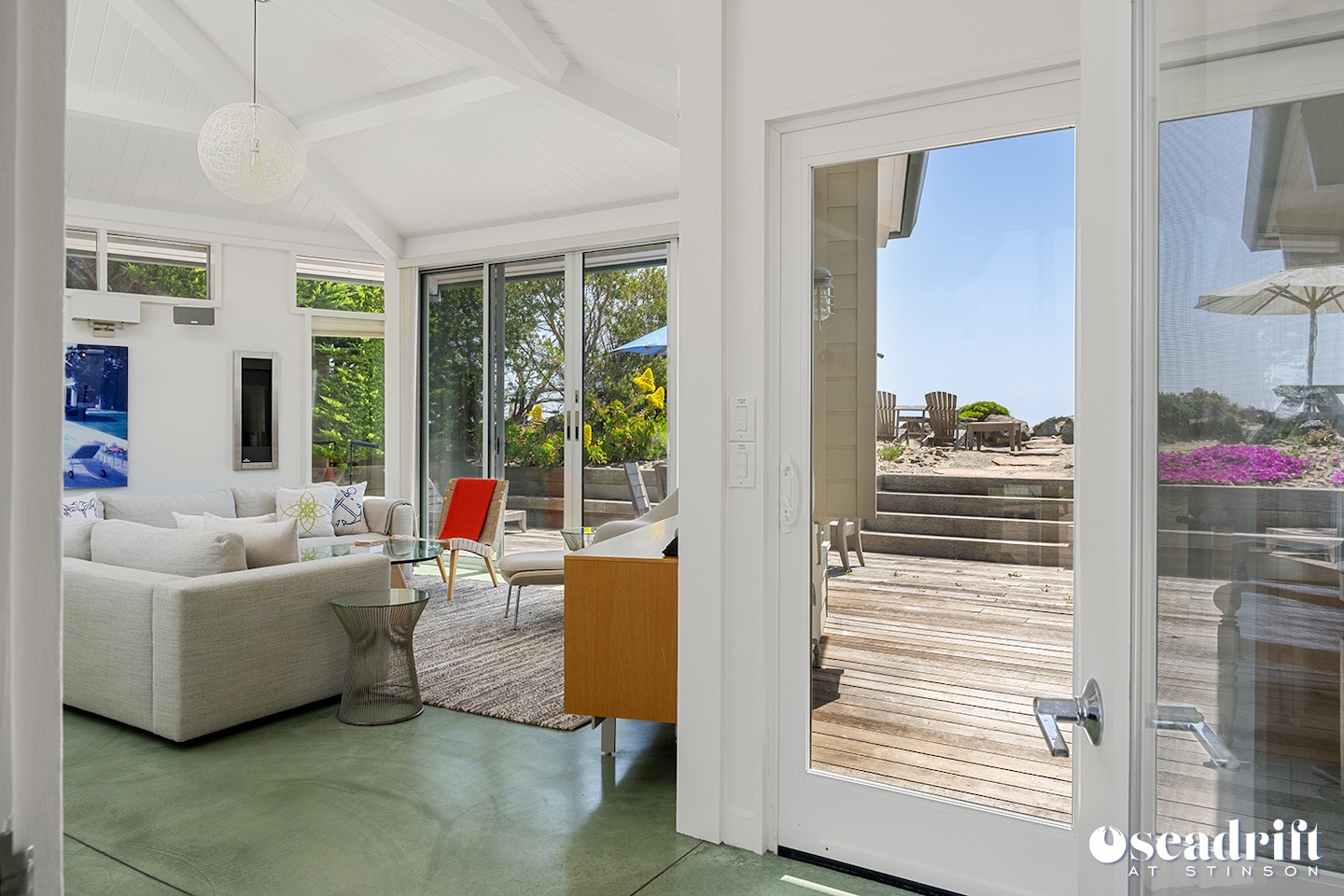 Light filled living, dining and kitchen under a domed shaped roof with skylights in the middle. Comfortable living room with floor to ceiling slider to the oceanside deck... (oc306)