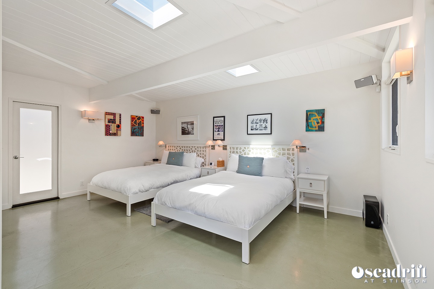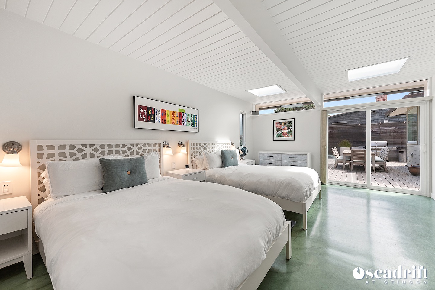 A second bedroom with two queen beds, bright with a couple skylights and a slider to front deck area. The detached third bedroom, also with two queen beds has its own bath with a jacuzzi tub and easy access to the alley way leading to the ocean patio.